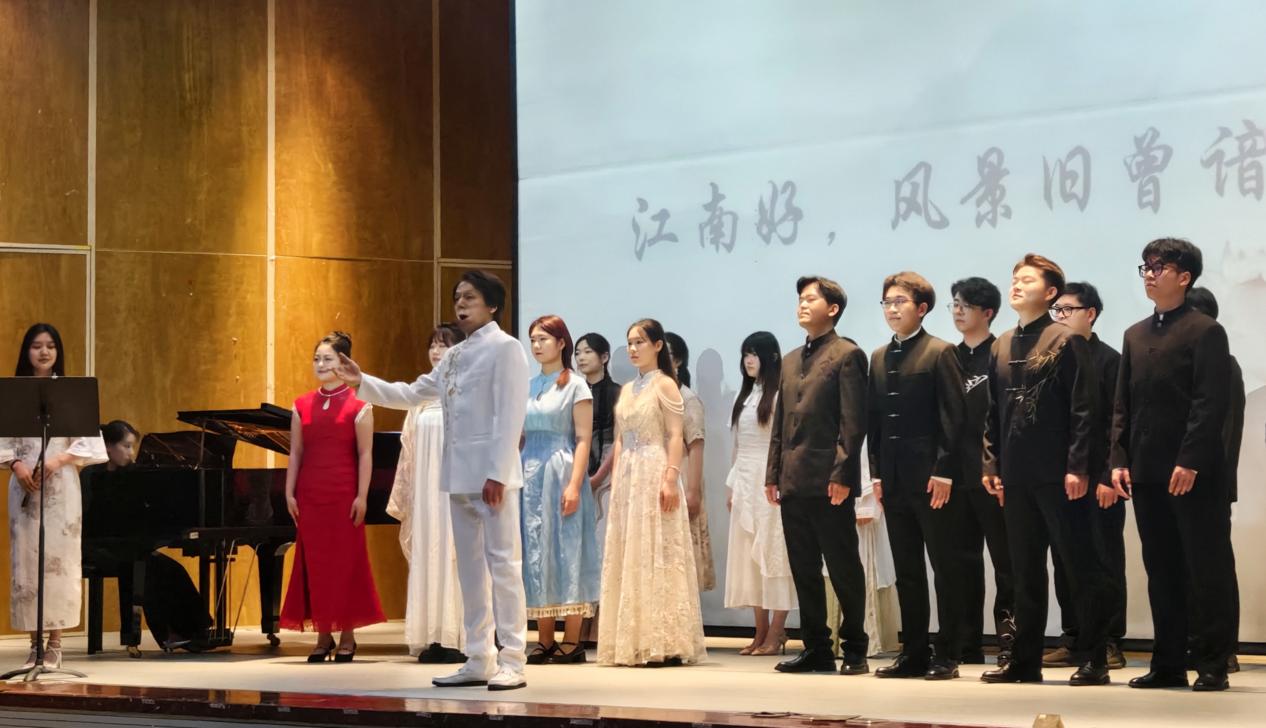 《蝶恋花·槛菊愁烟兰泣露》的凄怆花腔、《虞美人·听雨》的沧桑吟叹、《七步诗》的顿挫悲音……引入竹笛伴奏、师生共同合唱的《忆江南》则将本次审美实践推向了高潮与尾声。清越笛声和跃动琴声穿云裂帛,联同浑厚而清丽的众人之声共绘“春来江水绿如蓝”的江南盛景;合唱声浪和竹笛华彩汇聚攀升,引发观众席间久久不息的如潮掌声与真情喝彩。
