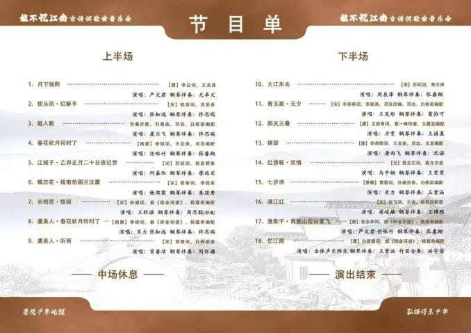 本场古诗词歌曲音乐会,以唐诗宋词为经纬,将十余首为人们耳熟能详的千古经典串联于一堂,构建起一场贯通古今的美学洗礼——《青玉案·元夕》《虞美人·春花秋月何时了》《渔歌子·西塞山前白鹭飞》等演出节目,凭借女声独唱、男声重唱、师生合唱等多种演唱形式,再辅以钢琴、竹笛的中西器乐伴奏,巧妙婉转地将诗词里的言语意境同音乐的旋律节奏完美交织。