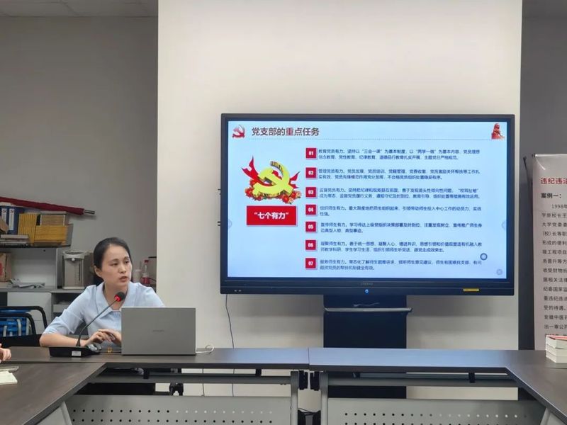 活动伊始,学院专职组织员李玲老师开展党务知识培训。她结合习近平总书记关于基层党建工作的重要论述,强调了基层党支部在党务工作中的重要性。随后,李老师围绕“党支部工作标准”、“党支部工作实务”、“下半年重点工作”三个方面展开培训,详细讲解了支部委员的工作任务、工作职责,并对学院党员发展流程及具体材料要求、“三会一课”、支部会议记录、支部主题党日活动开展、支部材料提交等内容展开说明。最后,李老师对下半年发展党员工作提出了具体要求,希望各学生党支部书记、支部委员能够在今后的工作中踔厉奋发,不断提升党支部凝聚力、战斗力。