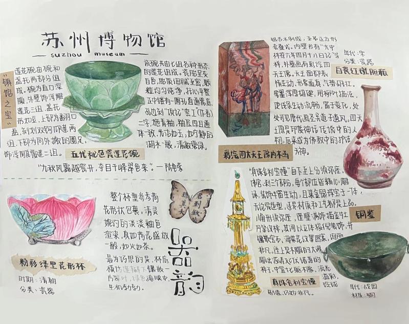 “笔墨苏珍”实践团队前往苏州博物馆、吴中博物馆参观调研,从众多文物中选取了不同时代、不同历史、不同工艺的文物,如《七君子图》、真珠舍利宝幢、秘色瓷莲花碗、吴王夫差铜剑等,这些文物各具特色,充分展现了苏州文化的历史底蕴。
