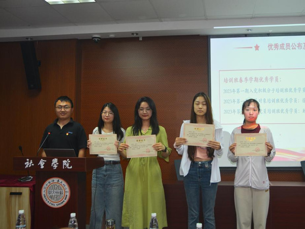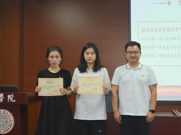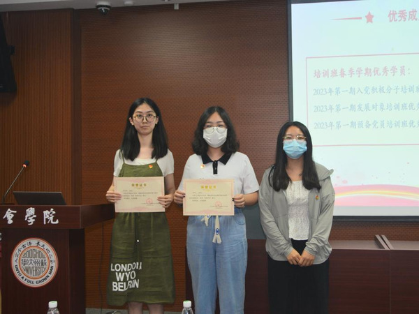 第四部分本期优秀学员的公布与分享。孙帅老师、孙柏林老师和朱星洁老师分别为入党积极分子培训班、发展对象培训班与预备党员培训班的优秀学员颁发奖状。发展对象培训班优秀学员徐梦同学从“书本知识与实践相契合”、“内心的力量与信仰”两部分分享了她在本期培训班期间的成长感悟,表达了自己将在日后的时光里继续学习和传承雷锋精神,全心全意为人民服务的决心。预备党员培训班优秀学员顾佳榕同学表示作为新时代青年,我们要争做一个“信念坚定”、“主动作为”、“不忘初心”的人,不断奉献出自己的青春力量。