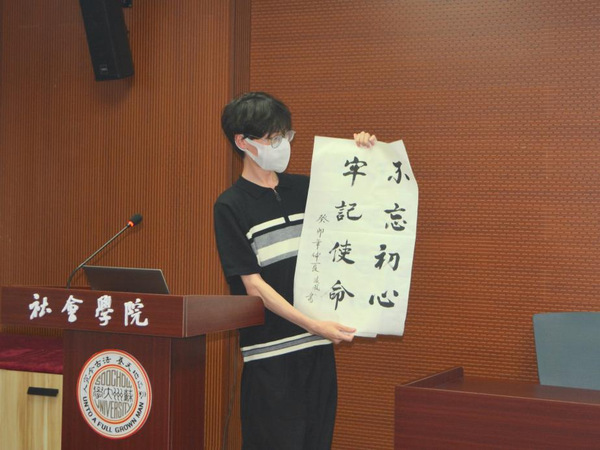 第三部分阅读成果汇报与红色经典朗诵展示环节。首先,分党校活动部从党建书屋阅读分享系列活动中评选出了两位同学进行阅读成果汇报。夏凌风同学从“能吃苦”、“爱学习”、“办实事”三方面分享了《习近平的七年知青岁月》的阅读感悟,并向大家展示了自己“不忘初心、牢记使命”这八字的毛笔作品。夷静同学则是从《习近平的七年知青岁月》中体悟到了“奋斗的青春最美丽”,她表示我们要切实把为人民为中心的发展思想落实到实现中国梦的伟大实践中。