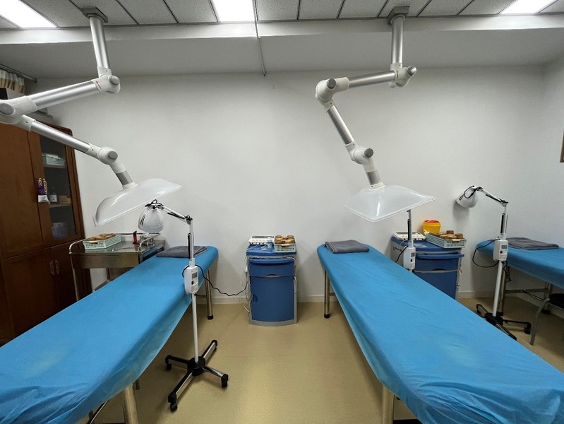到达悦龄健康综合服务中心的第一站,工作人员带领师生参观了第一个服务点——四季晶华社区卫生服务站。该卫生站除了开展针灸、艾灸等常态化的中医服务项目外,还特别设立了儿童推拿、儿童药浴等特色服务。同时它作为嵌入式社区卫生服务站,定期会有专家下沉社区,使居民在“家门口”就能享受到优质且便捷的基层医疗卫生服务。