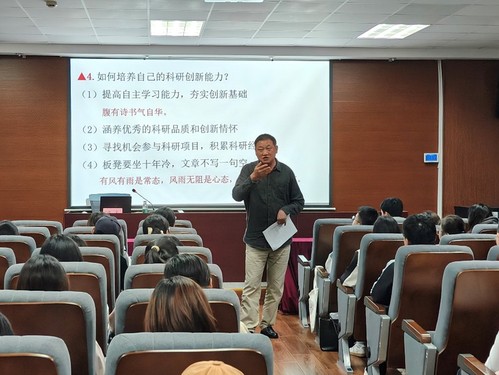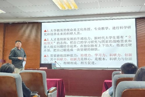 讲座伊始,方文教授立足“科研人才的培养”主题,指出了大学教育的使命之一是培养未来的科研人员,强调新时代大学生要把科研力与创新力作为核心能力培养,明确学习目标,夯实创新基础,努力涵养优秀的科研品质和创新情怀,在实践中不断积累科研经验。他认为,天赋、兴趣、勤奋与方法是科研的四要素,大学生应努力提高自主学习能力,积极参与科研创新项目,努力成为具有创新精神与人文关怀的新时代人才。