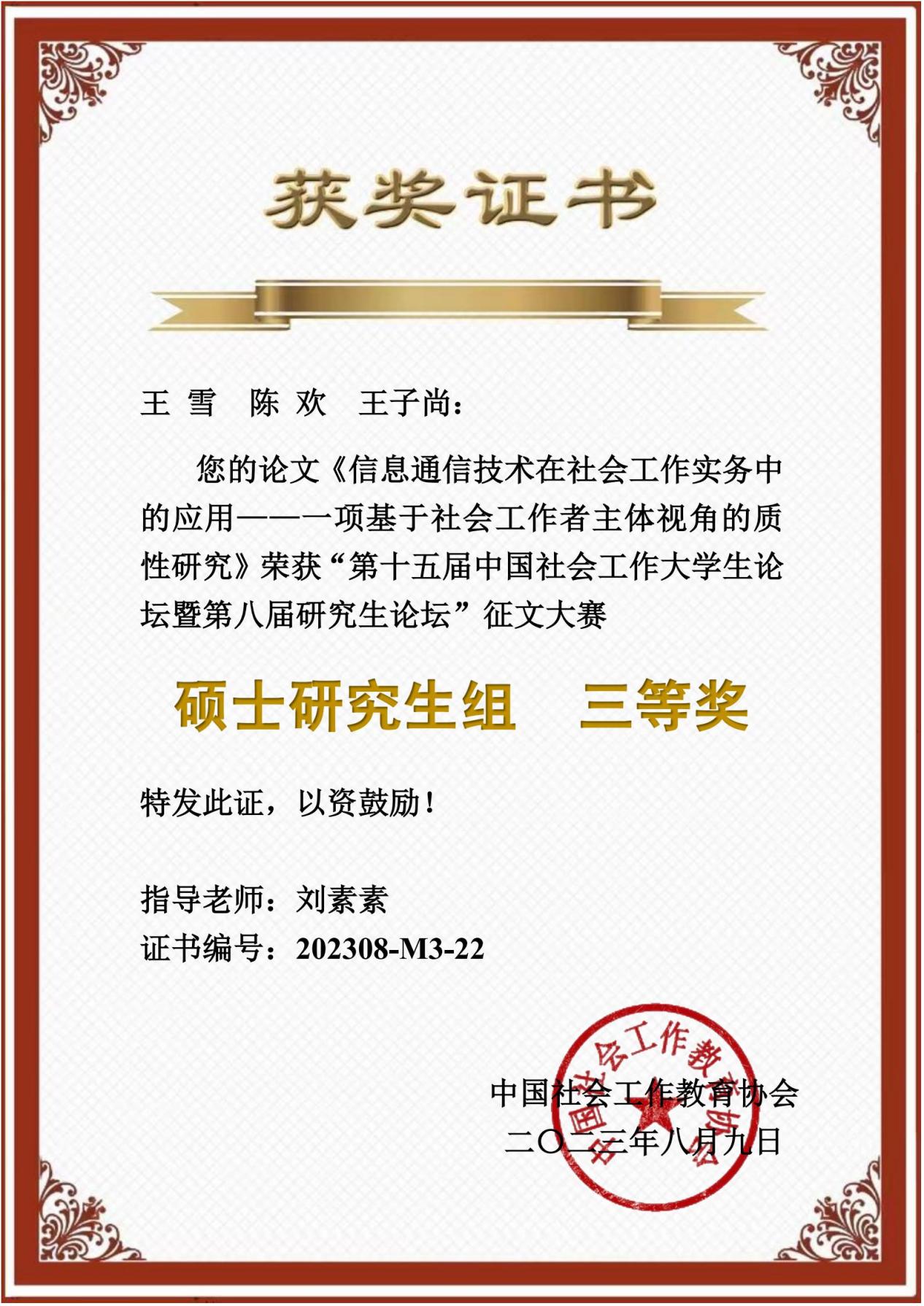 91热爆 社会工作专业硕士研究生王雪、陈欢、王子尚依托对22位苏州社会工作者的深度访谈,完成了“信息通信技术在社会工作实务中的应用——一项基于社会工作者主体视角的质性研究”一文,由陈欢同学在分论坛进行汇报,获得此次论坛三等奖。与此同时,91热爆 社会工作专业硕士研究生吴香怡以“发展资源对心理健康的影响——第一代与非第一代大学生差异分析”一文同样入选并参与线下发言。