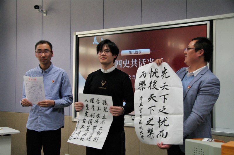 活动最后,19级历史专业本科生郁凯文、韩浩鹏在现场进行了书法展示。郁凯文同学展示了软笔书法,写下了范仲淹“先天下之忧而忧,后天下之乐而乐”的名句和毛泽东同志的名言“孩儿立志出乡关,学不成名誓不还。埋骨何须桑梓地,人生无处不青山。”他表示,作为党员应时刻怀有忧患意识,要好好学习,坚持终身学习。韩浩鹏同学则用硬笔书法展示了习近平总书记在建党100周年的讲话中对青年同志的寄语,呼吁在场党员珍惜当下,砥砺奔向新未来。活动在热烈的掌声中落下帷幕。