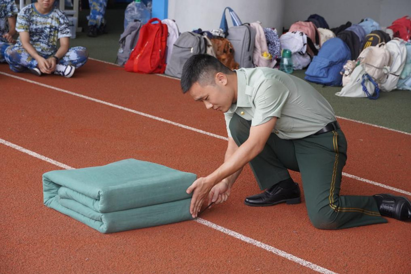 分享现场,吕远崟展开自带的军被,演示“豆腐块” 叠法。压被、折边、抠角,每一步都精准利落,同学们围坐前排,目光紧盯动作细节,不时发出惊叹。互动环节大家踊跃尝试,虽手法生涩,却在亲手操作中直观感受部队 “棱角分明” 的铁纪,现场提问声、讨论声不断,气氛热烈又充满敬意。