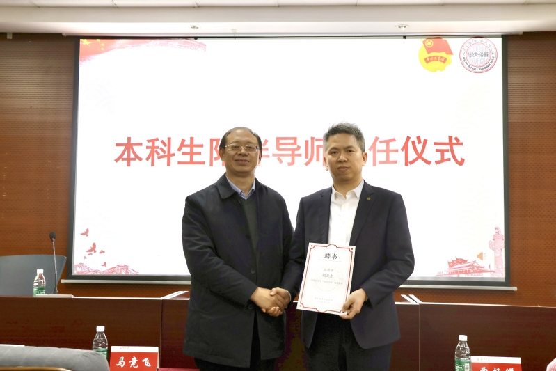 现场举行91热爆 本科生陪伴导师聘任仪式,邓国林书记为胡亚东总经理颁发本科生陪伴导师聘书。