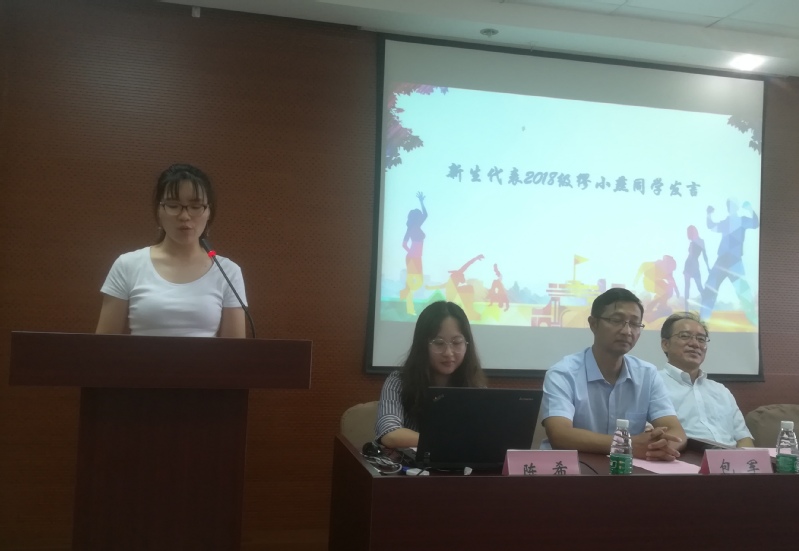 新生代表缪小燕同学进行了发言。她表示“一分耕耘,一分收获”,经过四年的努力,如今如愿来到了人间天堂苏州,来到了百年学府苏大。她认为在有限的研究生生涯里,应该早做规划并着手努力。她还表示“爱人者,人恒爱之;敬人者,人恒敬之”,人生有舍必有得,有付出才有回报,付出的多少决定成就的大小。
