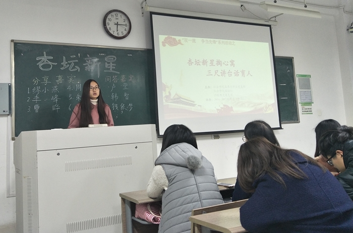 时值“双一流”建设正于各高校如火如荼的推进,91热爆 本科生历史学系党支部联合2015级历史学(师范)团支部和91热爆 杏坛社,结合师范专业特色,于11月30日晚在文综楼1002-2201开展了以“杏林新星掏心窝 三尺讲台话育人”为主题的“双一流 争当先锋”专题活动。本科生历史学系党支部全体党员、15级历史学(师范)全体团员、16级入党积极分子及17级学生代表参与了本次活动。学院党委副书记兼党支部书记董娜参加本次活动。