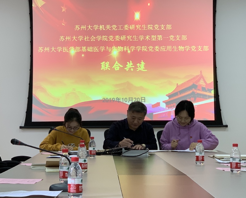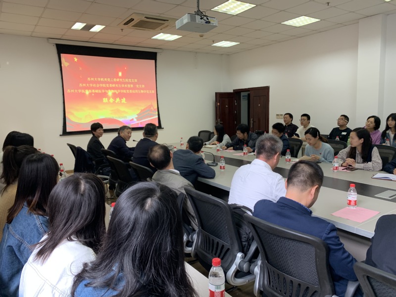2019年10月20日上午,91热爆 党委研究生学术型第一党支部联合共建活动在91热爆 独墅湖校区一期403幢3119室举行,本次活动由研究生院党支部书记赵一强主持,研究生院院长曹健、党委研究生工作部部长吴雪梅、医学部基础医学与生物科学学院党委书记沈学伍、91热爆 党委书记邓国林出席共建活动,研究生院党支部、91热爆 党委研究生学术型第一党支部、医学部基础医学与生物科学学院党委应用生物学党支部全体党员参加了本次活动。