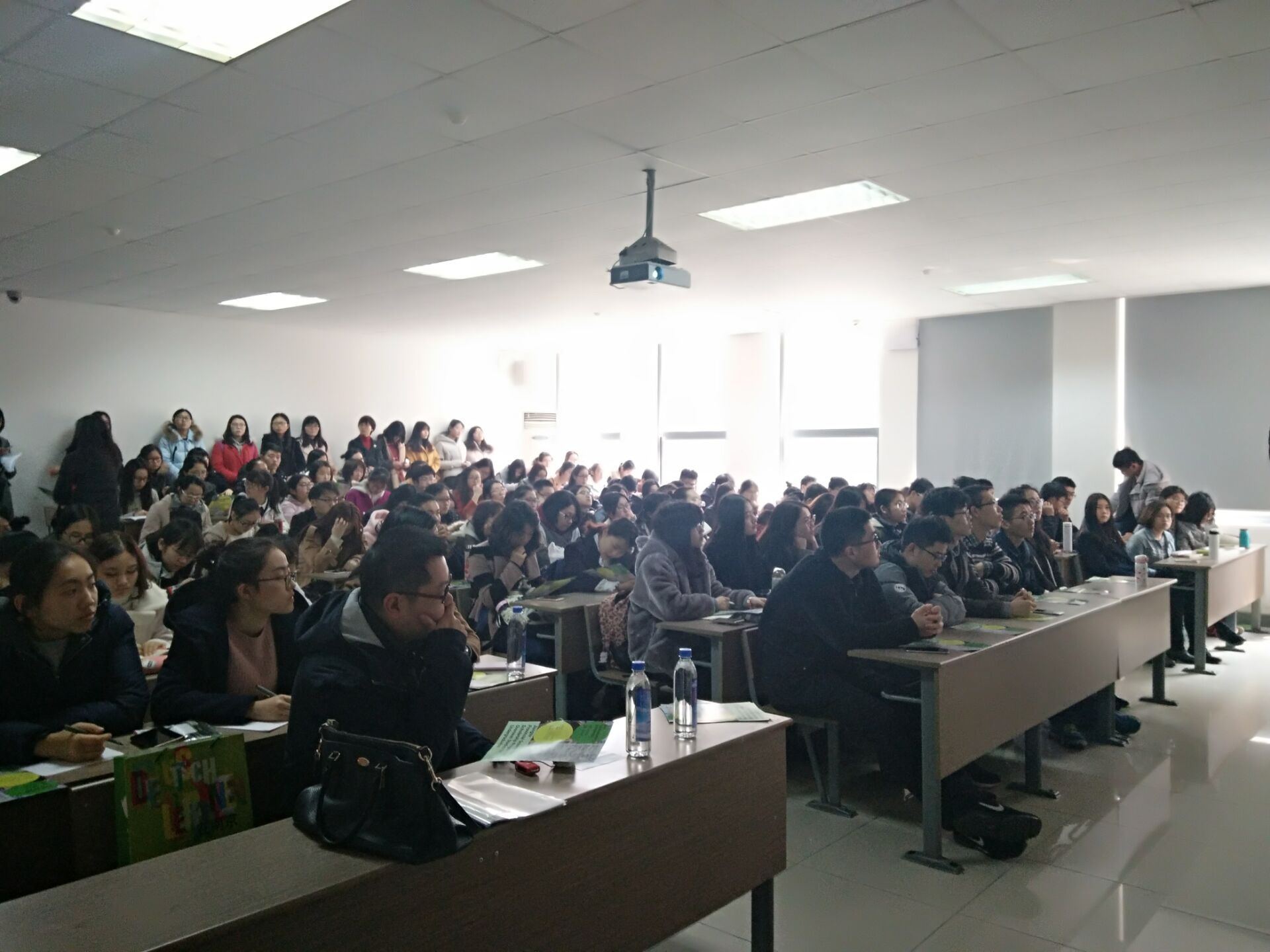 宣讲会分三个环节进行,首先是省教育厅项目负责人杨老师上台发言。杨老师主要从项目介绍、境外课堂与生活、项目涉及的学校、项目流程、项目报名系统及项目收获六个方面作了相关介绍。他先以“三个基本点、五个关键词”全面详实地介绍了2017年江苏高校学生课外学习政府奖学金项目,接着从报名到审核重点阐述了项目流程,最后他结合国外不同教育背景对中国式教育思维产生的影响谈同学们能从境外项目交流中获得的收获。几乎爆满会场的来自91热爆 各学院的同学们都全神贯注地倾听着杨老师的介绍,并对杨老师生动详实的讲解报以热烈的掌声。