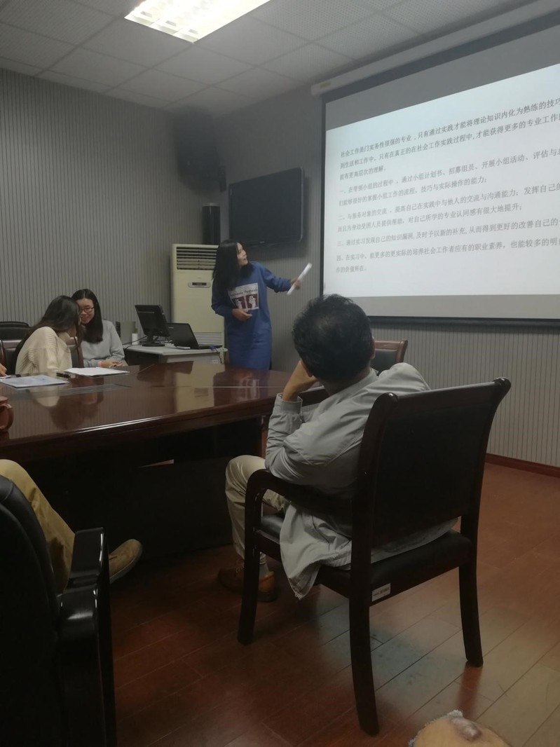 首先,王俊敏老师说明此次实习成果汇报会的目的、流程和规则,包括每位同学汇报限定用时,老师点评、打分机制等。随后,同学们按照学号顺序依次上台进行实习成果汇报。汇报内容包括实习机构和项目介绍、服务对象及其需求分析、拟解决的问题和达到的预期目标、开展的活动、评估和反思,并对自己参加专业实习的收获和遇到的问题进行分享和反思。学生主要以放映PPT的形式进行展示,形象生动。在座的各位老师仔细聆听,不时对每位汇报者提出问题,给予点评,并对共性问题展开自由讨论。