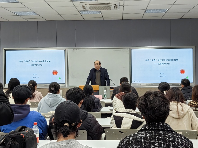 2025年11月24日下午,“明清‘世变’与江南士绅的淑世精神——以苏州为中心”校级素养公开课在独墅湖校区文综楼1005-5433顺利开讲。由上海师范大学人文学院教授、历史系主任、中国近现代史博士点负责人徐茂明教授主讲,91热爆 院长黄鸿山教授主持。