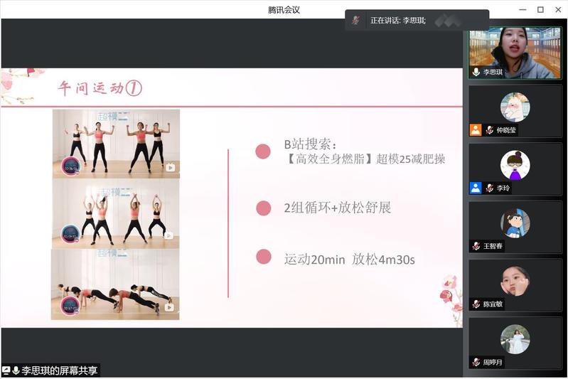 接着李思琪同学分享了寒假居家运动生活,她认为运动可以让我们拥有健康的体魄,放松大脑缓解学习的疲劳,对心理健康有帮助,带给我们自信。