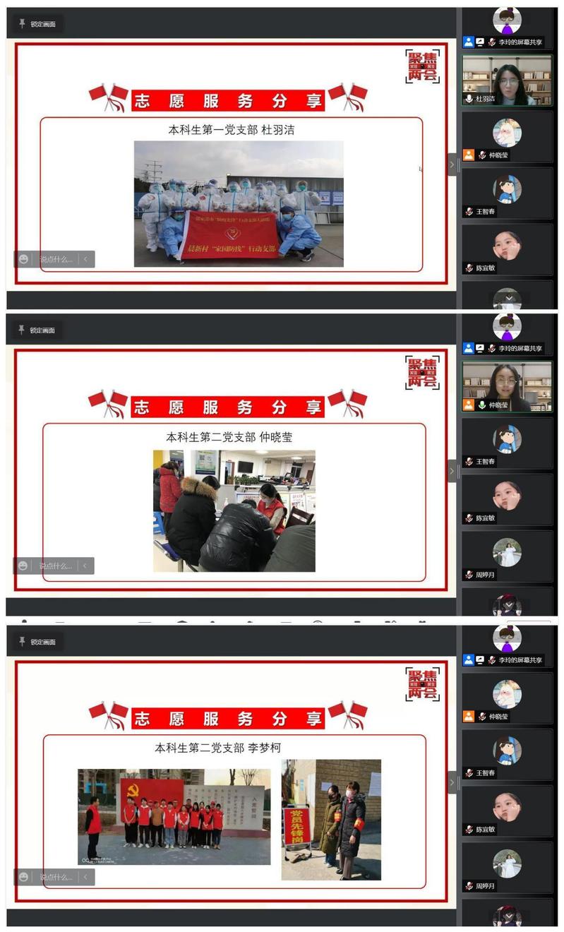 “疫”起分享环节,支部邀请四位党员代表分享疫情期间的志愿服务、居家学习运动经历。首先,杜羽洁同学分享了在苏州成为疫情防控志愿者的经历,她主要负责受检群众的信息采集录入,以及样本的封管、封箱、转运。接着李梦柯同学分享她在许昌的经历,在社区出入口执勤,对所有进出人员进行体温测量、信息登记。仲晓莹同学则是在无锡市的社区大厅负责扫码测温、来往人员登记、签署个人承诺书、开具核酸检测证明单等。她们都认为志愿服务活动不仅能锤炼意志品质、提升个人能力素养,还能收获守护家乡的自豪感,体现大学生的奉献精神。