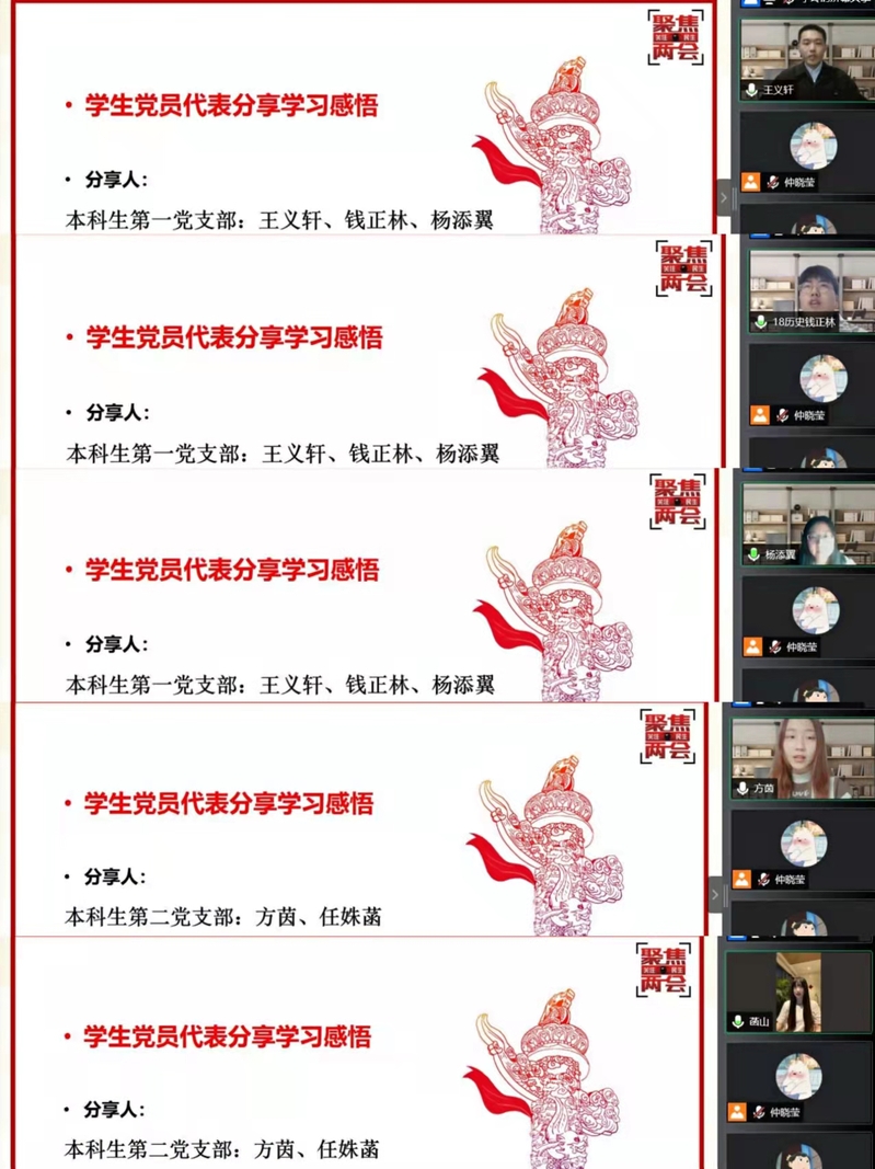 “疫”起研讨环节,学生党员纷纷热情分享理论学习感悟。王义轩同学关注今年“两会”教育问题和“双减”政策,他认为我们应该还孩子们一个健康、快乐、阳光的童年和少年时光。结合习近平总书记讲话,他认为青年应当筑牢理想根基,永远跟党走,贯彻党的群众路线,练就过硬本领,奋进新时代,建功新时代。钱正林同学认为在平时的生活中,要有服务群众的意识,从小事做起,不忘共产党人的初心与使命。锤炼对党忠诚的政治品格,在思想上与党中央保持高度一致。杨添翼同学谈到在实现中华民族伟大复兴的新征程上,必然会有艰巨繁重的任务,不能一蹴而就,需要每一位新时代中国青年的奋斗与奉献。方茵同学认为自己作为大四即将步入社会的毕业生,要勤学多问,不断提高自己的业务水平,业绩是靠干出来的,杜绝表面工作。任姝菡同学分享到这次“两会”最让她印象深刻的是关于妇女权益的讨论,期待未来我国妇女权益问题能得到更好的完善。