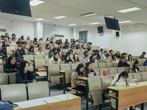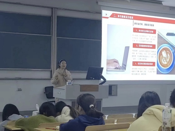 紧接着,2021级社会学专业池瑞华同学就职业规划经验进行分享。她结合自身实习经历,向大家分享了一些实习方法与技巧。池瑞华建议同学们积极关注实习信息,例如通过各大就业平台、微信公众号、学院就业信息群等途径获取实习信息。除此之外,她还鼓励同学们多向师兄、师姐们请教,获得最直接、真实的经验,为就业做好准备。