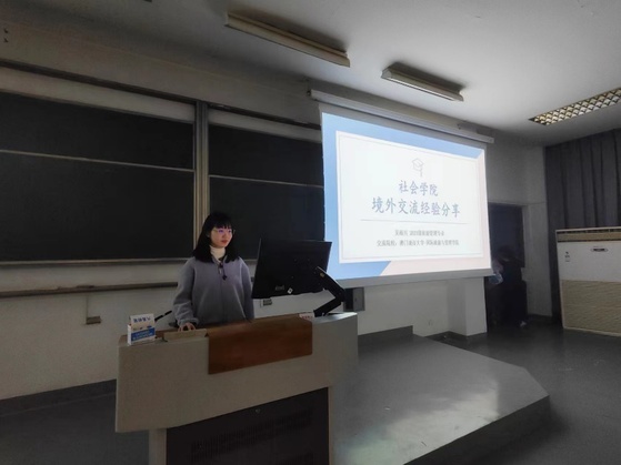 2020级旅游管理专业吴雨川同学进行了境外交流经验的分享。首先,她向大家介绍了境外交流所需要的申请条件;其次,她分享了对于是否要出国(境)留学的个人考量,为2023级新生提供了借鉴与启发;最后,她还向同学们展示自身在澳门城市大学交流学习时的校园生活与丰富收获。