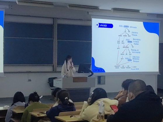 紧接着,2021级社会学专业池瑞华同学就职业规划经验进行分享。她结合自身实习经历,向大家分享了一些实习方法与技巧。池瑞华建议同学们积极关注实习信息,例如通过各大就业平台、微信公众号、学院就业信息群等途径获取实习信息。除此之外,她还鼓励同学们多向师兄、师姐们请教,获得最直接、真实的经验,为就业做好准备。
