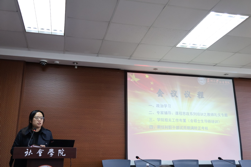 会议首先进行课程思政暨青年教师能力提升工程系列培训——教师礼仪专题。商学院汪晓媛副教授进行了题为《教师礼仪与修养》的讲座,她从礼仪的内涵、教师的仪容、教师的仪态、教师的着装、教师的言谈、教师的行为举止、教师的社会交往以及工作场合的一般礼仪等八个方面进行讲述,在讲解过程中不时为在座的教师进行生动具体的礼仪示范,汪教授精致的妆容、优雅得体的举止、清晰明确地表达、恰到好处的肢体师范给大家留下了深刻的印象。
