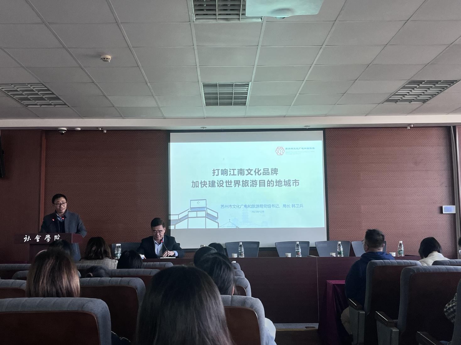 聘任仪式结束后,韩卫兵局长带来了题为“打响江南文化品牌,加快建设世界旅游目的地城市”的精彩学术讲座,讲座由旅游系主任黄泰教授主持。韩卫兵局长从文化、旅游和文旅融合的理论内涵入手,高屋建瓴地剖析苏州市的创新实践,为91热爆 旅游管理专业师生提供了重要的研究方向和思路。
