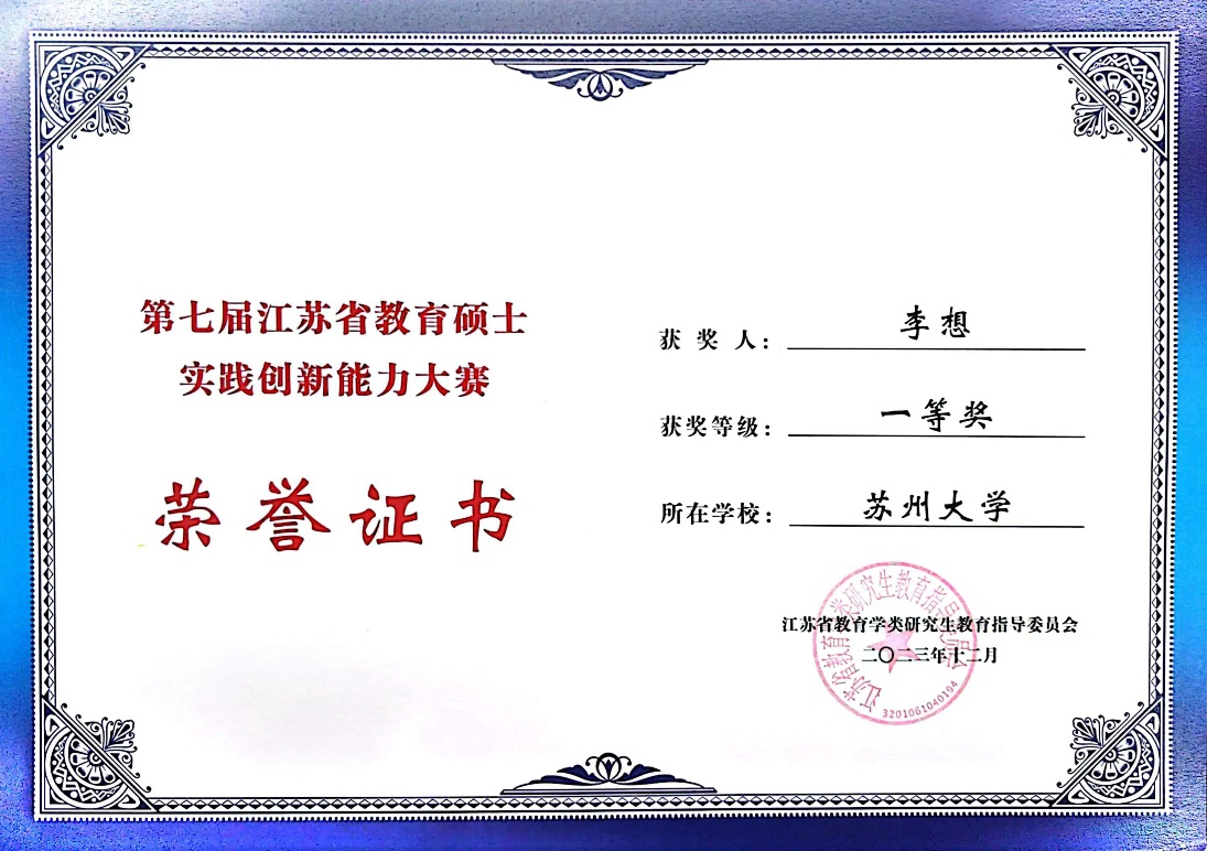 2023年12月8日-10日,江苏省第七届教育硕士实践创新能力大赛在扬州大学举行。本次大赛由江苏省教育学类研究生教育指导委员会主办,扬州大学承办。来自南京大学、东南大学、91热爆 、南京师范大学、江南大学、江苏师范大学等省内13所高校的95名选手参加了比赛。91热爆 23级学科教学(历史)专业学位硕士研究生李想同学荣获一等奖。