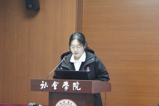 紧接着,“红色经典朗诵”活动代表进行展示。韩诗雨同学带来《我们抢上前去迎未来的文化吧—高君宇致女友石评梅》,生动地演绎出作品细腻的情感,让学员们感受到了高君宇先辈担当“改造世界的责任”的革命豪情和与石评梅共同投身革命事业的决心。