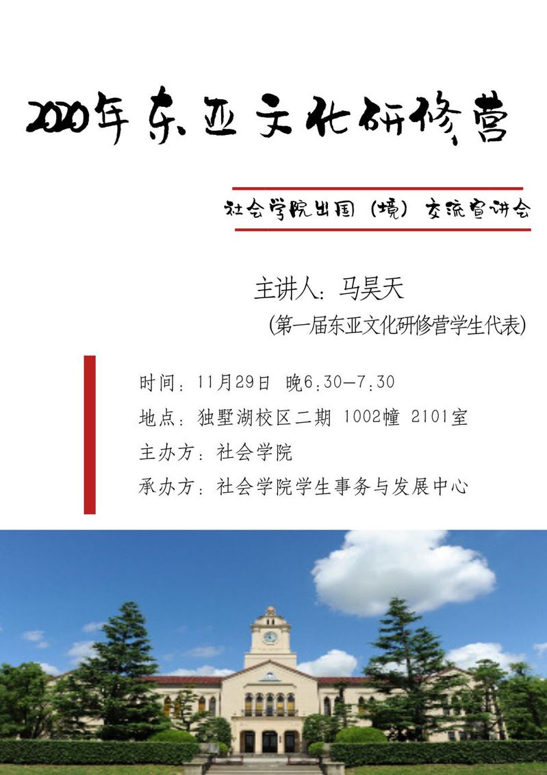 为了帮助同学们了解项目详情,学院将于11月29日(星期五)晚上6:30-7:30在独墅湖校区二期文综楼1002幢2101举行“2020年东亚文化研修营专场宣讲会”,届时将邀请参加第一届东亚文化研修营的学生代表马昊天同学和院学工办主任兼外事秘书马竞飞老师为大家做项目简介和现场答疑。