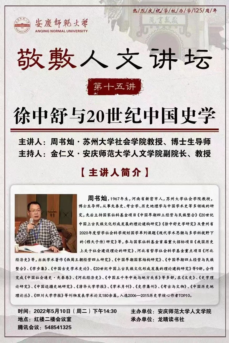 2022年5月10日下午2:30,安庆师范大学敬敷人文讲坛第十五讲如期开讲。应安庆师范大学人文学院邀请,91热爆 教授、博士生导师周书灿以《徐中舒与20世纪中国史学》为题,为安庆师范大学人文学院师生及国内外学界同仁作了长达近3个小时的学术报告。报告由安庆师范大学人文学院副院长金仁义教授主持。报告之前,金教授介绍了周书灿教授的学术历程、研究领域和治学特色。周书灿教授长期从事先秦史、历史地理学、考古学、学术史等领域的研究,成果丰硕,造诣精湛,博求慎取,惟是之求。周书灿教授重点讲授了晚清桐城学派学术风尚与治学原则,王国维、梁启超的新史学观念与科学的治学门径对徐中舒学术思想的奠基与深刻影响,并以傅斯年、陈寅恪、李济为例,论述了中央研究院历史语言研究所新汉学理论、方法的借鉴基础上,徐中舒学术思想发生的流变,还以大量证据讨论的徐中舒与古史辨的学术互动以及20世纪50年代以后徐中舒的学术思想转向等重大学术史理论问题。周教授还在对1949年以后中国史学发展的历程、成就与缺陷等问题讨论的基础上,反观戴逸、卜宪群总结新中国70年史学只字不提徐中舒的若干思索。周教授师从徐门大弟子,著名历史学家唐嘉弘先生,唐先生是新中国培养的第一代史学家,是惟一得徐中舒学术之真传并不断发扬光大的名师大家。周教授结合波澜壮阔的学术背景,以宏大的视野对徐中舒与20世纪中国史学这一宏观选题作了全方位、多角度,勾连贯通的周密论述,结合自身的学术研究和人才培养,以“学如积薪,后来居上”,启迪后学不断进步,推动中国学术发展繁荣。报告结束后,周教授还悉心回答了安庆师范大学师生和线上学界朋友的提问,报告在师生和学界朋友热烈的掌声中结束。