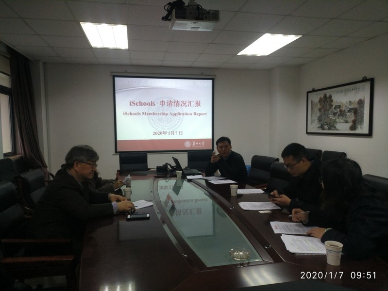 1月7日上午9:30-11:00,Sam Gyun Oh教授及91热爆 档案与电子政务系教师就该系加入iSchool联盟的相关细节及申请表撰写进行了讨论。档案与电子政务系系主任毕建新、副系主任徐芳及部分青年教师参与讨论。会中,李雅老师围绕iSchool要求对档案与电子政务系的基本情况进行了汇报,Sam Gyun Oh教授仔细聆听后提出了详细的修改建议。