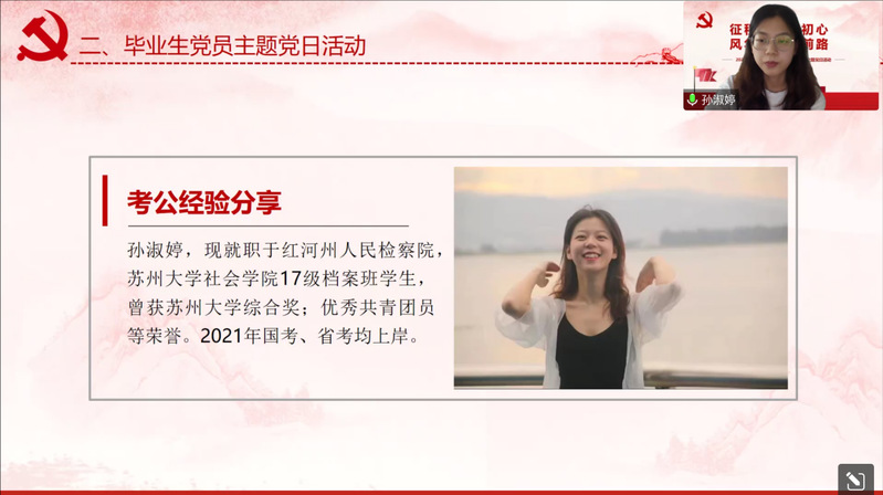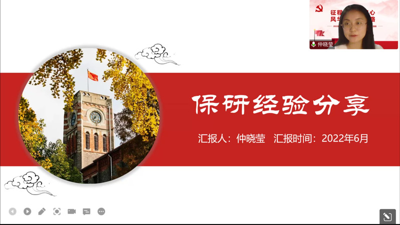 随后,毕业生党员代表2017级档案学孙淑婷、2018级档案学仲晓莹、2020级学科历史翁静分享她们在考公、保研、就业方面的经验和心得。孙淑婷分享了选岗-笔试-面试的考公全过程中自己的备考经历,建议大家考公岗位选择要慎重,提出笔试部分行测做题要精、申论卷面要清秀,面试部分要避免套路化。仲晓莹从校内推免资格、保研流程、信息搜集渠道三方面详细阐述自己的保研经验。翁静向大家介绍了就业信息的获取渠道、教师资格证笔试复习的主要内容、面试的前期准备与试讲的技巧。
