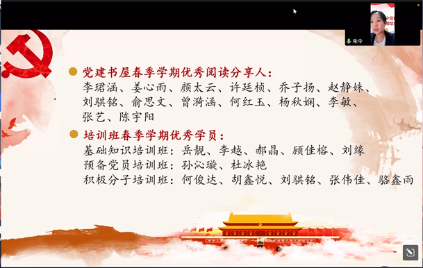 紧接着,朱今书记宣布了培训班春季学期优秀学员名单和党建书屋春季学期优秀阅读分享人名单。她向顺利结业的学员表示祝贺,并嘱咐各位学员在今后的工作和学习中坚持高标准严要求,努力发挥表率作用。