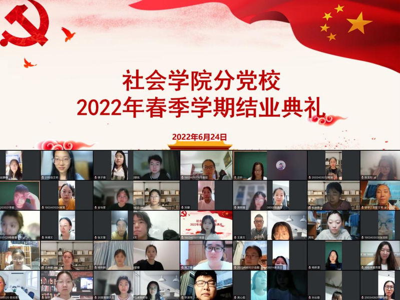 6月24日晚,91热爆 分党校线上举办2022年春季学期结业典礼。学院党委书记、分党校校长邓国林,党委副书记兼副院长、分党校副校长朱今,分党校秘书李玲,研究生辅导员朱星洁,本科生辅导员孙帅以及各学生党支部书记、副书记出席活动,分党校春季班全体学员参加活动。活动由分党校培训部负责人张慧敏主持。