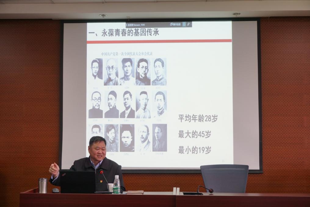 第一个方面是永葆青春的基因传承。姜建成教授首先向大家展示了2017年10月31日习近平总书记及全体新当选的中央政治局常委在浙江嘉兴南湖革命纪念馆重温入党誓词的照片,并提到习近平总书记希望每一个党员都应当以入党誓词的要求来严格要求自己,增强党的先进性和纯洁性。他还向大家介绍了马克思于17岁中学毕业时所写的文章——《青年在选择职业时的考虑》和其一生为人类社会所做出的重要贡献。紧接着,姜建成教授从中国共产党第一次全国代表大会通过的《中国共产党第一个纲领》来揭示中国共产党在一大时就确立了党的性质、党的指导思想、党的奋斗目标,就将马克思主义写在了旗帜上。在革命道路上,一个又一个共产党员慷慨就义,他展示了萧楚女、陈延年、陈乔年、赵一曼、方志敏等烈士的遗照,并富有深情地朗读了方志敏烈士的《可爱的中国》。