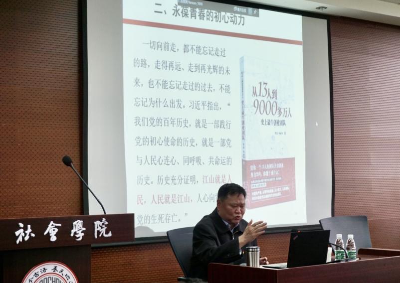 姜建成教授围绕习近平总书记在2021年2月20日党史学习教育动员大会上的重要讲话,从三个方面简要介绍了中国共产党的百年党史,即百年理论探索史、百年不懈奋斗史和百年自身建设史。在回顾党的光辉历程后,他从四个方面重点介绍了中国共产党永葆青春的奥秘。