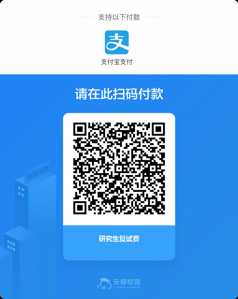 按照有关规定,复试费为80元/人。考生须在复试前扫描下方二维码缴费。未按时缴费者,不得参加复试。缴费后因各种原因未参加复试者,已支付的复试费不予退还