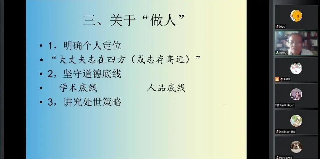 最后,金老师围绕“做人”讲解了三条原则。一是要明确个人定位,即根据自身实际情况,明确个人计划目标。二是要坚守道德底线,包括学术底线与人品底线:学术上要不怕艰辛,脚踏实地不寻找捷径;人品上要通过自身的反省与自律做到有原则、不出格。三是要讲究处事策略,既不能够过分妥协没有原则,也不能够与社会格格不入。