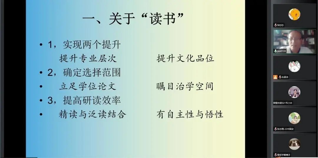 首先,金老师强调了关于“读书”的三个要点:一是要实现两个提升。一方面要提升专业层次,阅读本专业资料时,不仅要掌握一般性的专业知识,并且要尽可能尝试创新性地应用专业知识以解决该领域问题;另一方面要提升文化品味,在研读资料的过程中,尝试将其吸收融合进本专业的情境中,并通过情境再现的方式在社会中传播专业文化。二是要确定选择范围。想要在浩如烟海的书籍中找到自身需求,一方面是从入学开始就立足于学位论文选择阅读范围;另一方面要拓展阅读及研究空间。三是要提高研读效率。要将精读与泛读相结合,形成一体性的阅读效果;同时要有研读的自主性与悟性,会思考,有侧重。