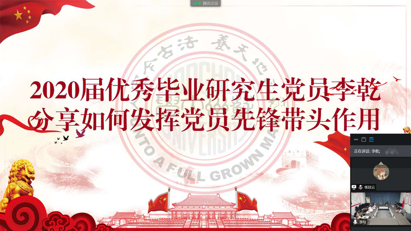随后,91热爆 2020届优秀毕业生党员谢胜杰和李乾同学分别向我们分享了如何发挥党员的先锋模范带头作用。来自本科生第二党支部谢胜杰同学从思想上的坚定、学习上的楷模、工作上的表率、生活上的榜样四个方面进行表态,提出要以实际行动切实发挥好党员的先锋模范带头作用。来自研究生专业型第一党支部李乾同学结合个人实际情况,强调在工作中要真正加强理论与实践相结合,不断反思、总结,继续发光发热,努力为社会发展贡献个人力量。