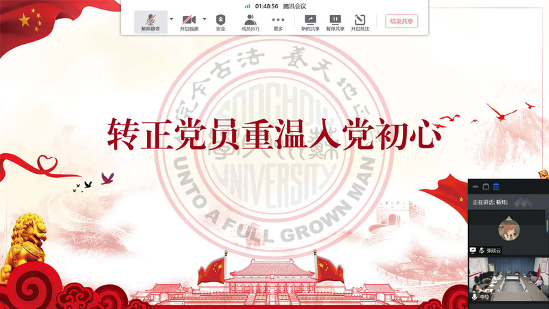 最后,三名转正党员重温了入党初心。来自本科生第一党支部的靳炜同学、本科生第三党支部的冯洁同学以及研究生学术型第三党支部的徐倩同学,结合自身的个人经历,与大家分享了自己与党的故事,在重温入党初心的同时,进一步坚定了理想信念,强调要始终牢记党员身份,增强使命担当。
