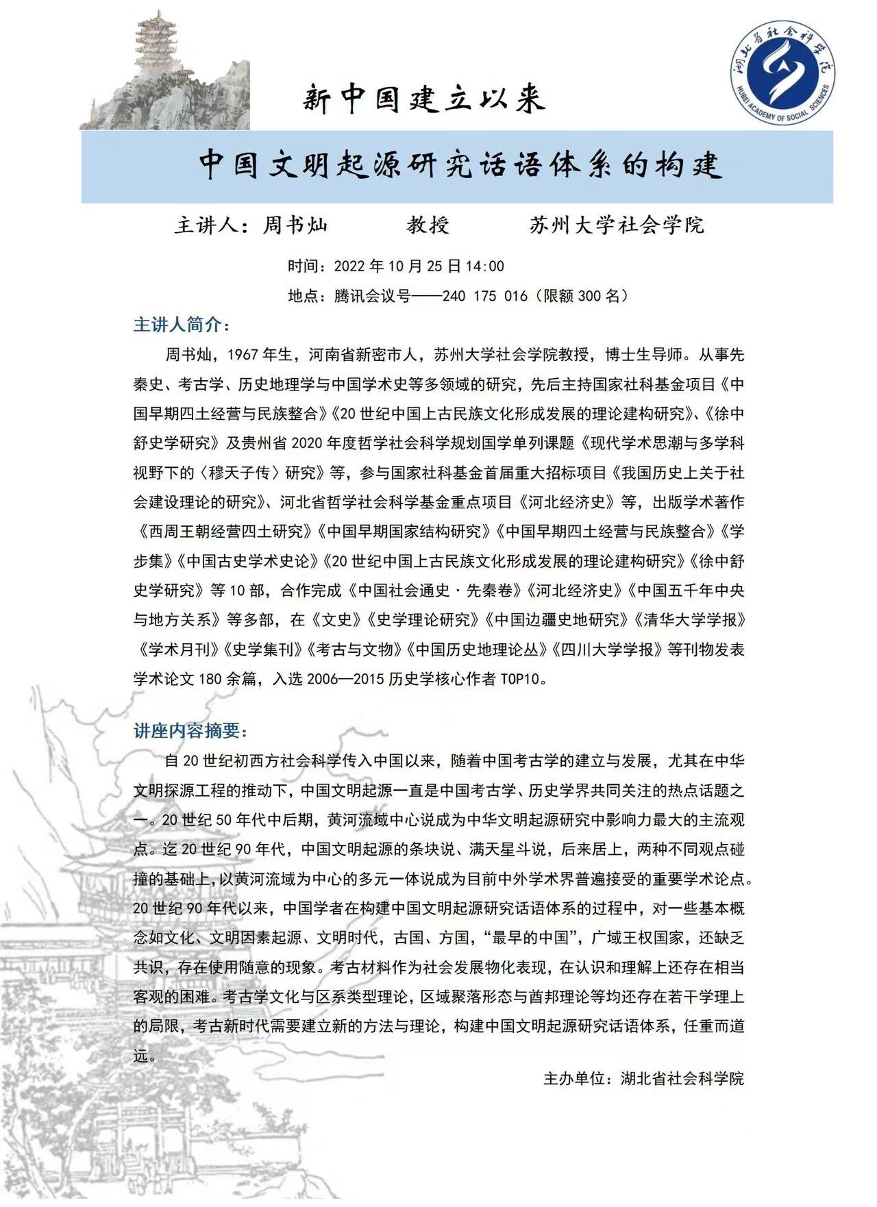 应湖北省社会科学院邀请,2022年10月25日下午,周书灿教授以《新中国建立以来中国文明起源研究话语体系的构建》为题,为湖北省社会科学院研究人员及研究生作了一场精彩的学术报告。报告由湖北省社会科学院文史研究所副所长曾成博士主持。